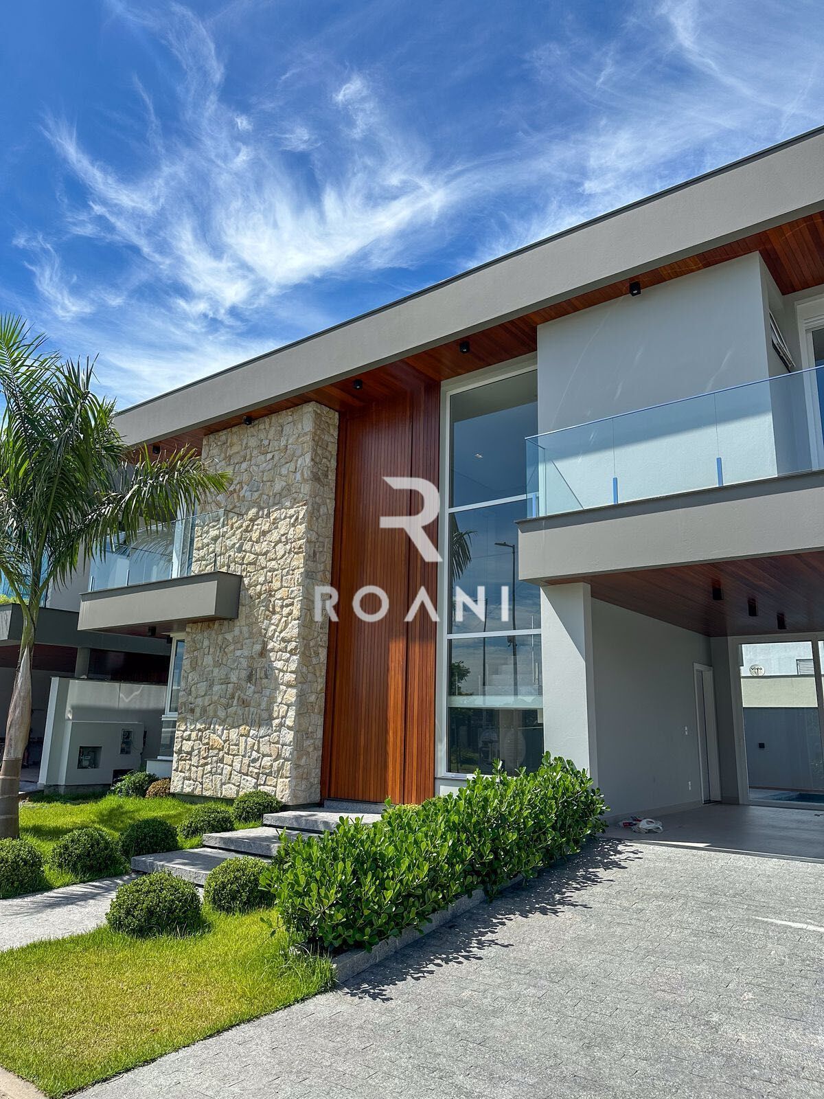 • Fachada com detalhes em pedra natural, madeira cumaru e paisagismo